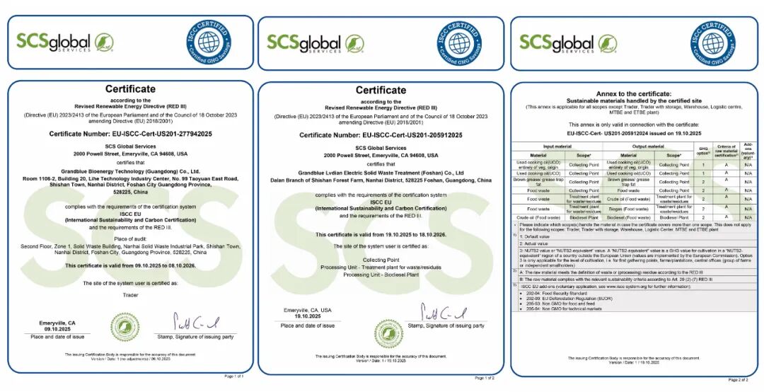 瀚蓝固废绿电公司、生物能源公司接连通过全球公认的生物质和生物能源认证——国际可持续发展与碳认证(ISCC)。这标志着生物能源公司销售的认证部分油脂产品具备进入欧盟生物燃料市场的强制性认证条件,也展现了绿电公司和生物能源公司建立并执行符合ISCC标准的管理体系,将有利于提高能源利用效率、减少资源浪费,实现环境效益与经济效益的双赢,赋能企业绿色低碳可持续发展。